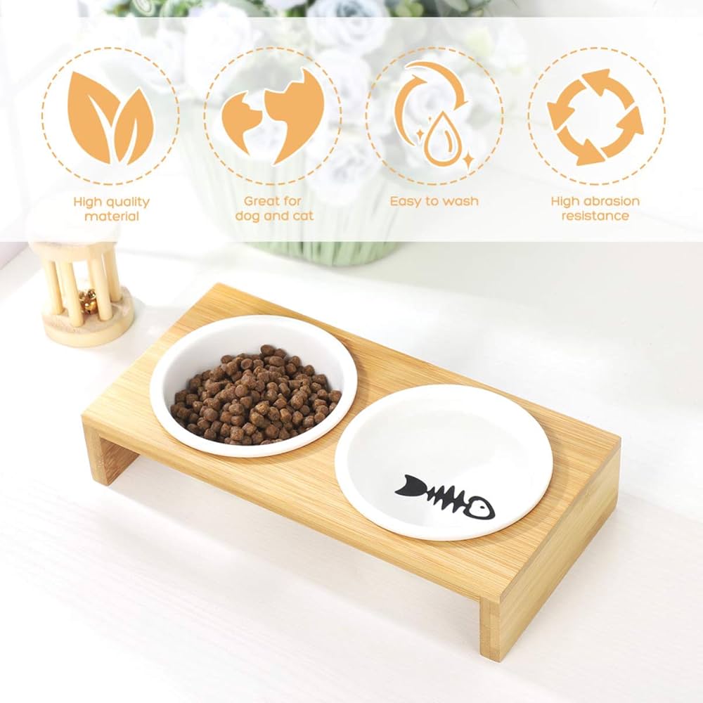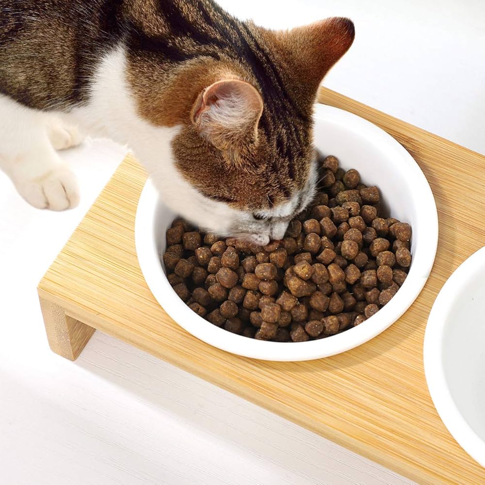 The elevated bamboo base helps improve digestion and posture by keeping food and water at a comfortable height. Each ceramic bowl is removable, easy to clean, and safe for both food and water.
