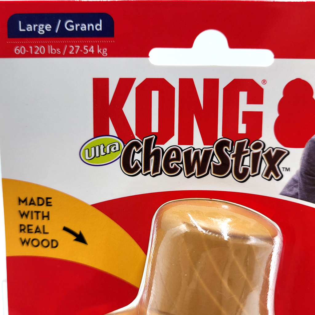 KONG ChewStix is a toy that contains real wood making it sure to delight those dogs that love to chase and chew sticks while providing a safer chewing solution. KONG ChewStixs also feature a bacon scent that entices and rewards appropriate chewing behavior. As dogs chew, the toy naturally flakes vs. splintering while being built for durability both combining to create chewing bliss that is built to last. Rounded edges and grooves continue the engagement while adding to the safety of the toy and helping clean teeth and gums.