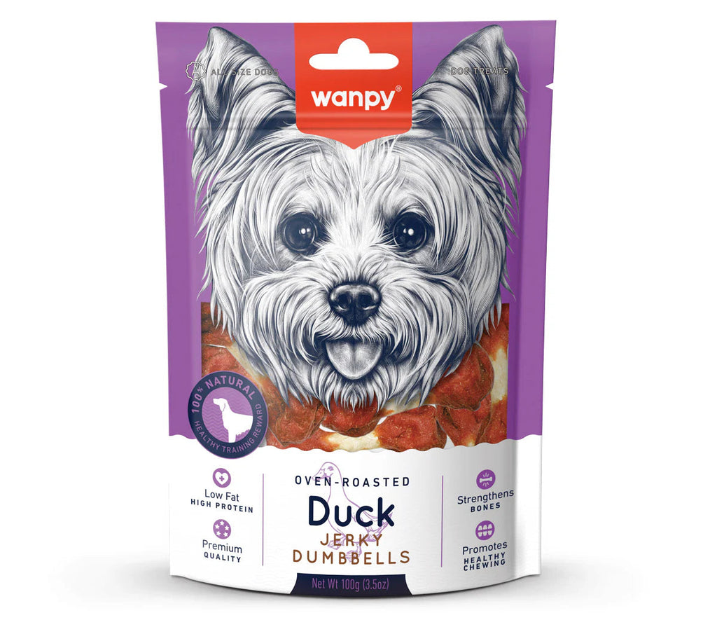 Wanpy Duck Jerky Dumbbells are specially formulated dog treats weighing 100 grams. Made from high-quality duck, these treats are a source of protein, supporting muscle development and overall health in dogs. Their unique shape aids in dental hygiene by promoting chewing, which can help reduce plaque buildup.
